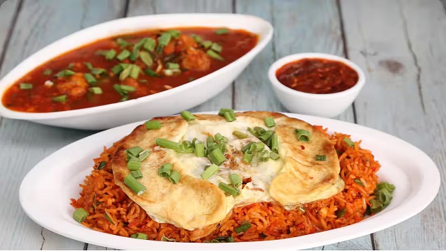 Heat oil on low heat. Lightly sauté broccoli, carrot, bell peppers, and cabbage. Add steamed rice and Schezwan sauce, then season with black pepper, white pepper, veg aromat, salt, and spring onion.