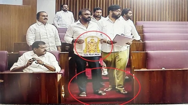 The conflict began when YSR Congress Party (YSRCP) members displayed placards showing Sri Venkateswara Swamy with sandals, which many found disrespectful. This led to shouting and arguments between the members of different parties.