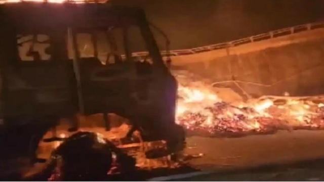 மோதிய வேகத்தில் தனியார் பேருந்து தீப்பிடித்து எரிந்தது. விபத்து ஏற்பட்டதும் பேருந்தில் இருந்தவர்கள் வெளியே குதித்து தப்பிக்க முயற்சித்தனர். இருந்தபோதிலும் தீ வேகமாக பரவியதாலும், விபத்தில் பஸ் சேதமடைந்து இருந்ததாலும் அவர்களால் தப்பிக்க முடியவில்லை.