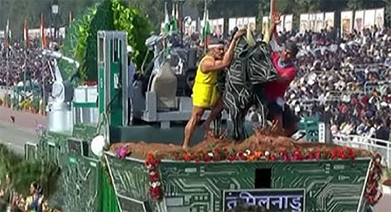 77 வது குடியரசு தின கொண்டாட்டம் – ஜல்லிக்கட்டு காளையுடன் பயணித்த தமிழக அரசு வாகனம்