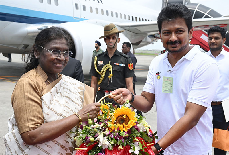 இந்திய ஜனாதிபதி திரவுபதி முர்மு இன்று 2 நாள் சுற்றுப்பயணமாக தமிழகம் வந்தார். மைசூருவில் இருந்து சிறப்பு இந்திய விமானப் படை விமானம் மூலம் மதியம் 11.40 மணிக்கு சென்னை வந்தார். விமான நிலையத்தில் அவரை கவர்னர் ஆர்.என்.ரவி, துணை முதலமைச்சர் உதயநிதி ஸ்டாலின் ஆகியோர் வரவேற்றனர்.